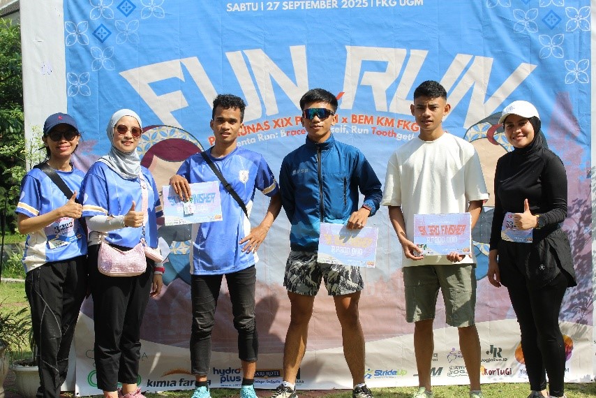 27 Sepetember 2025 sebanyak 425 peserta lari terdiri dari kategori 3K dan 5K dengan rute sekeliling kompleks Kampus UGM. Start Run Denta Fun Run by Pramunas PSMKGI XIX ini dibuka oleh Kepala Unit Kemahasiswaan dan Bimbingan Konseling FKG UGM, drg. Mohammad Fadyl Yunizar, MPH, Ph.D.