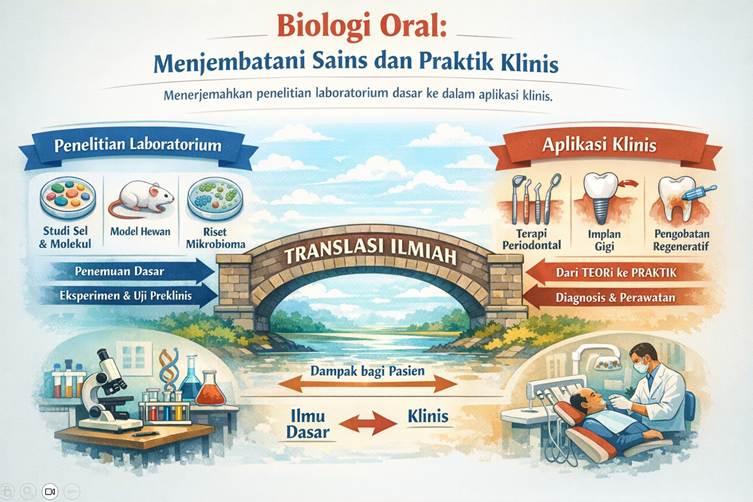 “Biologi oral mempelajari struktur, fungsi, hingga proses biologis di rongga mulut, termasuk interaksi mikroorganisme dan respons tubuh. Ini sangat penting untuk menjembatani penelitian sains dengan praktik klinis,” tegasnya.