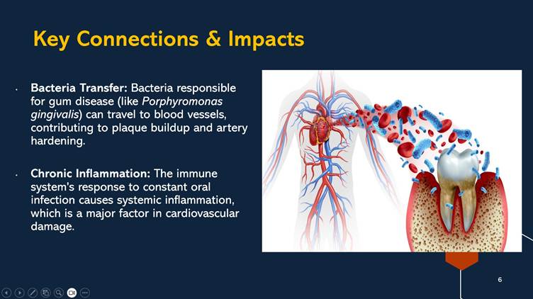 Prof. Tetiana menjelaskan bahwa bakteri seperti Porphyromonas gingivalis dapat berpindah ke pembuluh darah dan berkontribusi terhadap pembentukan plak serta pengerasan arteri.