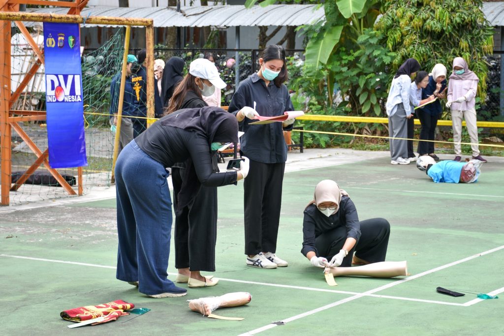 Ya! Ini adalah suasana pelatihan dasar identifikasi forensik bagi mahasiswa FKG UGM oleh DVI Bidokkes Polda DIY yang dipimpin oleh Kasubbiddokpol Biddokkes Polda DIY,AKBP drg. BUDI SANTOSO, Sp.Pros yang merupakan alumni FKG UGM Angkatan 1991 dan diterima oleh Kepala Departemen Radiologi Dentomaksilofasial FKG UGM, drg. Isti Rahayu Suryani, M. Biotech., Sp. Rad. O.M.(K). Sebanyak 80 mahasiswa FKG UGM Semester 7 dibentuk dalam kelompok untuk mengikuti pelatihan sekaligus simulasi identifikasi dasar forensik di area lapangan basket FKG UGM yang telah dikondisikan seperti Tempat Kejadian Perkara (TKP). Mahasiswa menyimak pemaparan dari DVI Bidokkes Polda DIY, kemudian melakukan simulasi identifikasi awal pada object yang berserakkan di area lapangan basket FKG UGM.