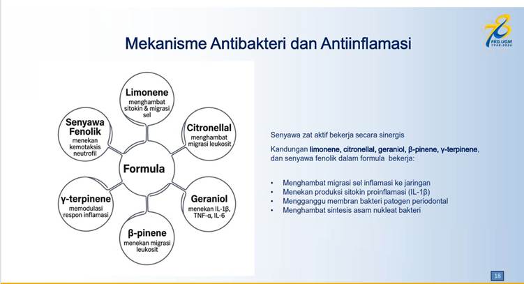 Yang menarik, formulasi obat kumur ini memanfaatkan bahan herbal khas Indonesia, yakni minyak serai wangi (Cymbopogon winterianus) dan minyak lemon (Citrus limon). Kedua bahan ini kaya akan senyawa aktif seperti limonene, citronellal, dan geraniol yang memiliki sifat antibakteri dan antiinflamasi.