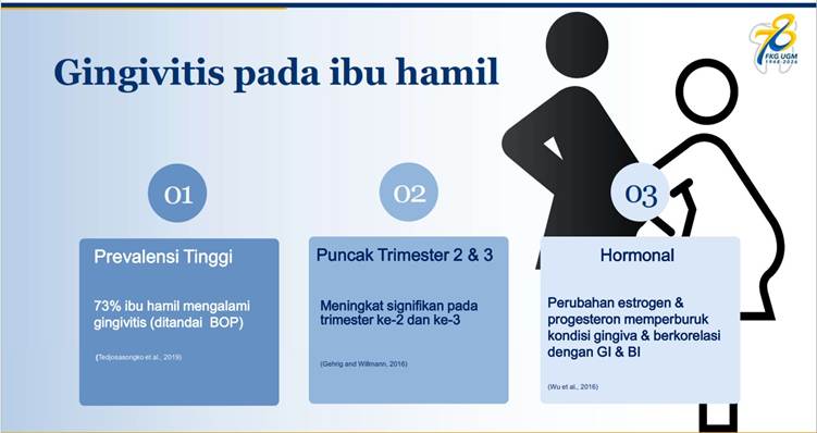 Penelitian yang dipaparkan oleh Dr. drg. Friska Ani Rahman, MDSc. dari Departemen Biomaterial FKG UGM, menyoroti tingginya prevalensi gangguan gingiva pada ibu hamil. Data menunjukkan, sekitar 73 % ibu hamil mengalami gingivitis, terutama pada trimester kedua dan ketiga, seiring perubahan hormonal yang memengaruhi kondisi jaringan gingiva.