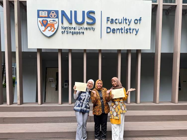 Kedua mahasiswa FKG UGM : Nabila Amelia Putri dan Annisa Zahro Nugroho, didampingi dosen FKG UGM, Dr. drg. Sri Budi Barunawati, M.Kes., Sp.Pros.(K), mengikuti rangkaian kegiatan akademik yang padat: observasi klinik, kuliah mini, seminar tematik, diskusi problem-based learning (PBL), hingga pengenalan fasilitas pendidikan dan laboratorium NUS. Model pembelajaran ini memberi ruang bagi mahasiswa untuk melihat secara langsung integrasi teori, etika klinik, dan teknologi dalam pelayanan kesehatan gigi di Singapura.