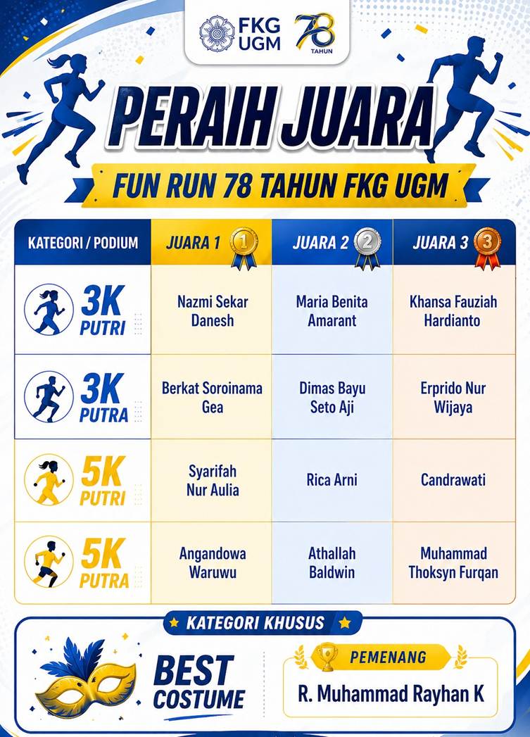 Acara yang digelar di kawasan kampus UGM ini diikuti ribuan peserta dari berbagai kalangan, mulai dari mahasiswa, dosen, tenaga kependidikan, alumni, hingga masyarakat umum. Selain sebagai ajang olahraga rekreatif, Fun Run FKG UGM 2026 juga menjadi ruang apresiasi bagi para pelari yang menunjukkan performa terbaiknya.
