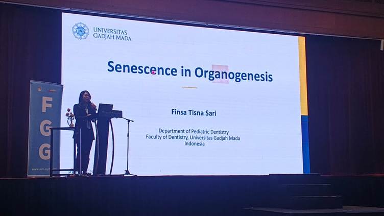 Dalam sesi simposium, kepakaran dosen FKG UGM kembali mendapat sorotan. Hubungan emosional dan akademik yang panjang antara UGM dan Niigata University terlihat jelas lewat tampilnya dua alumni doktoral Niigata sebagai pembicara undangan. Drg. Finsa Tisna Sari, M. Biomed., PhD, memaparkan materi mendalam mengenai “Senescence in Organogenesis”, sebuah topik biologi oral yang sangat fundamental.
