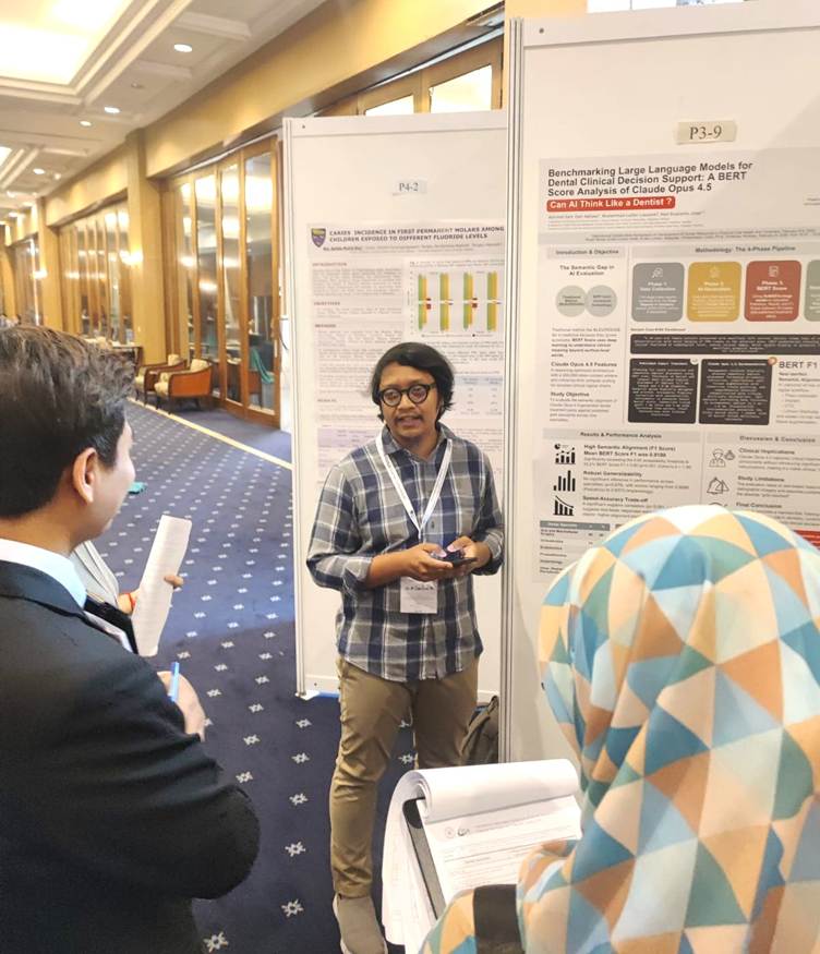 Di sisi lain, inovasi teknologi juga turut dipaparkan oleh drg. Achmad Zam Zam Aghasy, M.Kes. Melalui sesi presentasi poster, drg. Zam Zam mengulas potensi kecerdasan buatan lewat risetnya bertajuk “Benchmarking Large Language Models for Dental Clinical Decision Support: A BERT Score Analysis of Claude Opus 4.5”. Riset ini memantik diskusi hangat mengenai masa depan integrasi teknologi dalam pengambilan keputusan klinis dokter gigi.