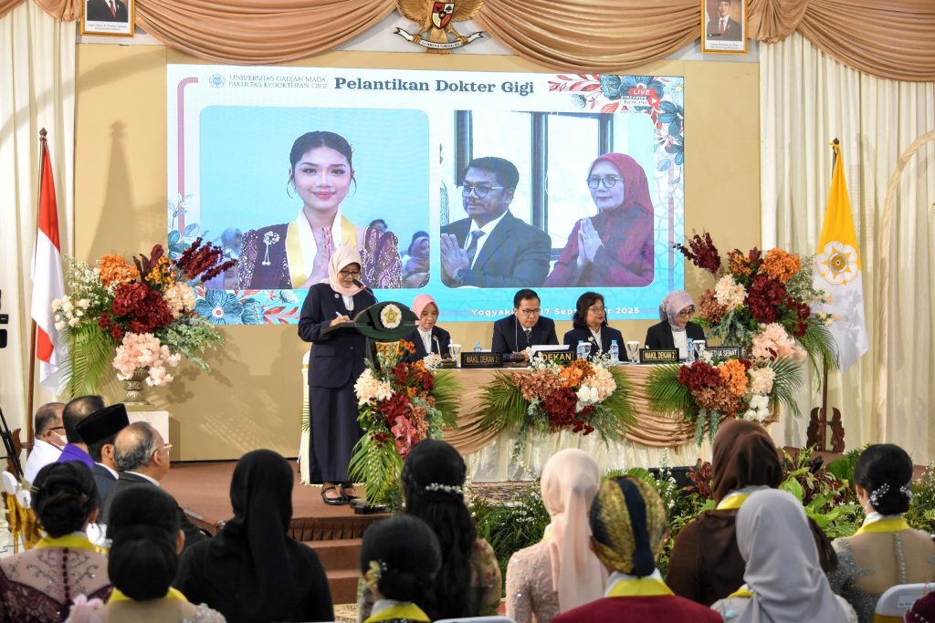 Acara pelantikan dokter gigi baru di Fakultas Kedokteran Gigi Universitas Gadjah Mada (FKG UGM) diawali dengan sambutan dekan FKG UGM yang penuh semangat dan kehangatan. Suasana ruangan yang semula khidmat seketika mencair saat dekan menyapa para tamu dengan canda ringan, menciptakan kesan ramah dan bersahabat bagi para lulusan yang baru saja dilantik.